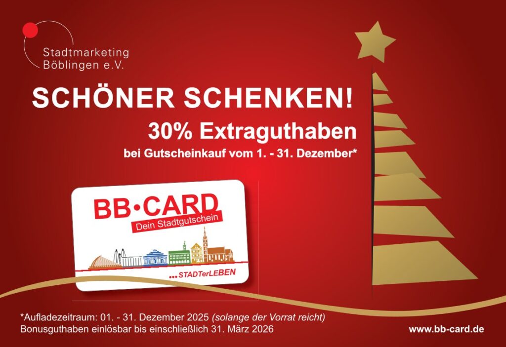 Mit der BB-Card haben Sie immer das richtige Geschenk. Der Geschenkgutschein ist bei zahlreichen teilnehmenden Händlern, Gastronomen und Dienstleistern in und um Böblingen einlösbar. So können Sie die Vielfalt der Stadt verschenken und gleichzeitig die lokalen Geschäfte vor Ort unterstützen – eine Win-Win-Situation!